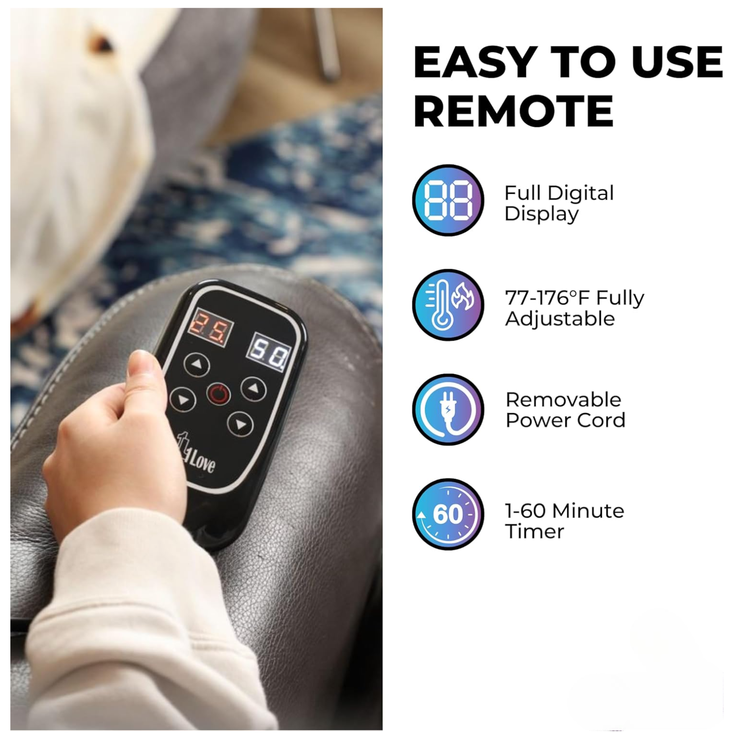 Adjustable Heat & Timer: Easily set the temperature between 77–176°F with the handy remote. The 1–60 minute timer and auto shutoff keep your therapy safe and stress-free.